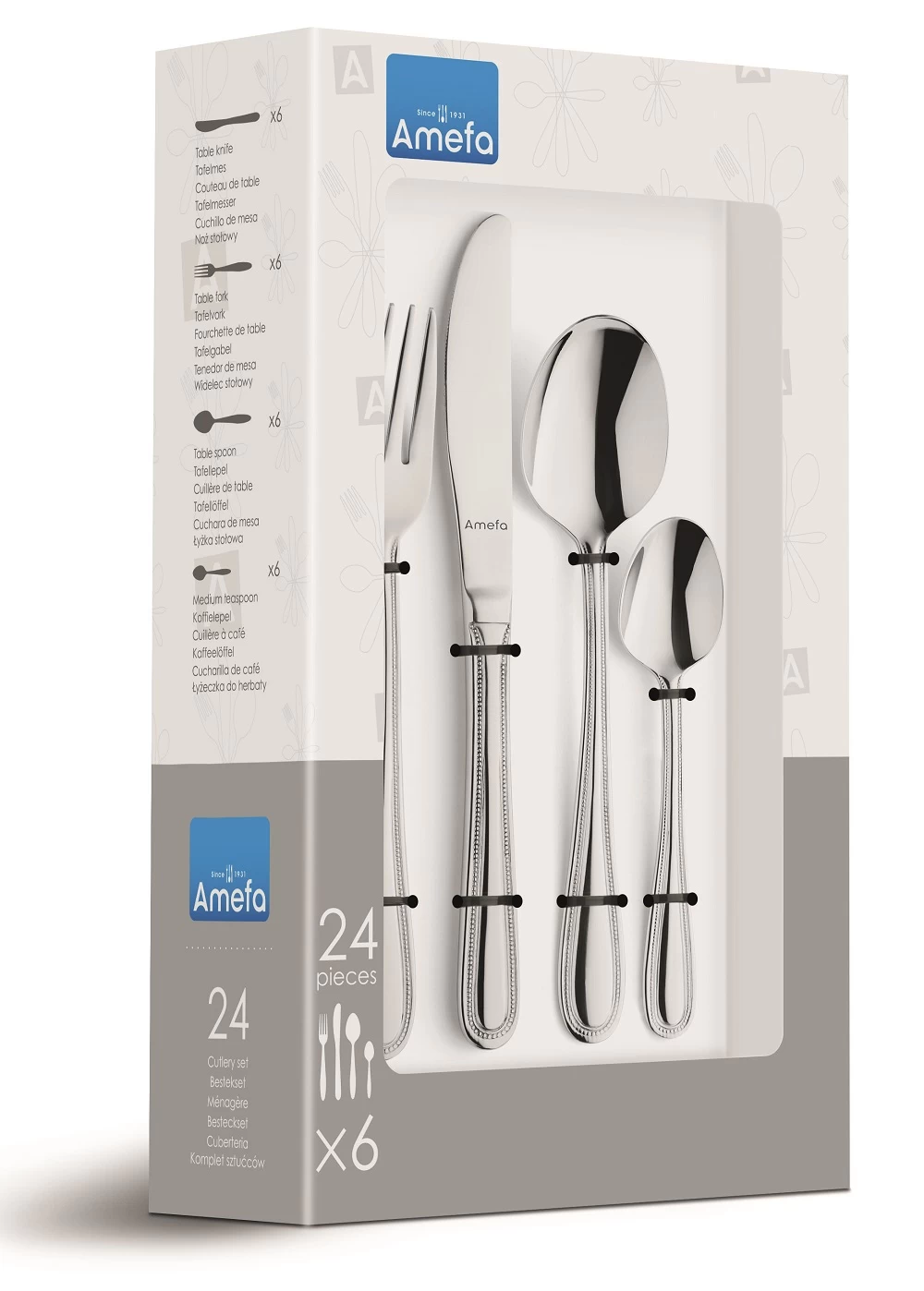 Kwaliteit staat bij Amefa hoog in het vaandel. Deze 24-delige bestekset is met grote zorg en precisie vervaardigd en is gemaakt van chroomnikkelstaal, beter bekend als 18/ 0 roestvrij staal. Bij 18/0 betekent dit 18% chroom en geen aandeel nikkel. Dit zorgt voor een hoge corrosie bestendigheid. Producten gemaakt van 18/0 staal kunnen gereinigd worden in de vaatwasmachine. Aangeraden wordt wel om direct na het eindigen van het programma het bestek droog te wrijven met een zachte doek.