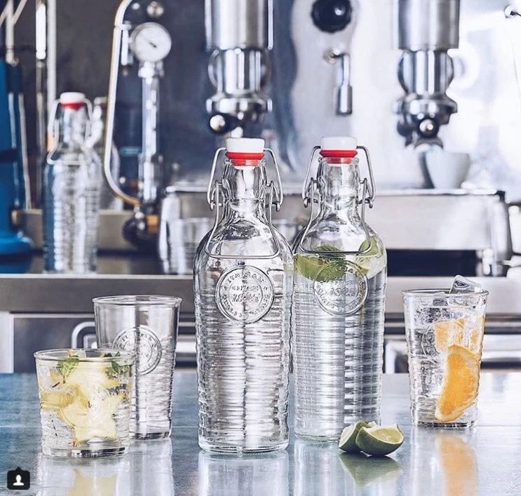 Een mooie beugelfles uit de Bormioli Officina collectie voor in ieder huishouden. De ribbels in het glas en het logo op de fles maakt de fles tot een echte aanwinst op het aanrecht. De Bormioli beugelfles Officina 1825 transparant heeft een inhoud van 1.2 liter en is in verschillende kleuren te bestellen. Daarnaast zijn er bij elke beugelfles bijpassende glazen te koop.