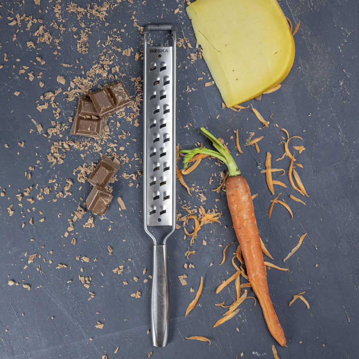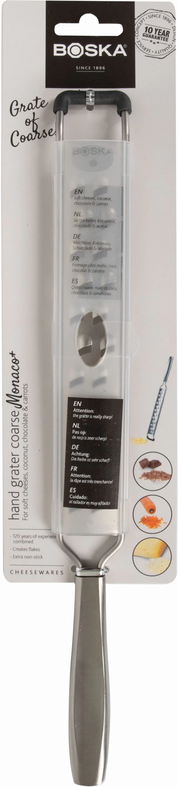 De Boska Rasp Grof Monaco+ is de ideale rasp om snel vlokken van jouw kaas te maken. Deze rasp is geschikt voor kaas, kokos, chocolade en wortel. Door de rubberen onderkant zet je hem gemakkelijk ergens op en glijdt hij niet weg. Dat maakt deze rasp ook erg veilig. Een ideale grove rasp voor iedere keuken dus!