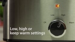 Zuinig: De slowcooker kookt de hele dag, maar gebruikt niet meer stroom dan een gewone gloeilamp. Op de lage stand (LOW) is het gebruik tussen de 75 en 150 watt en op de hoge stand (HIGH) tussen de 150 en 210 watt.