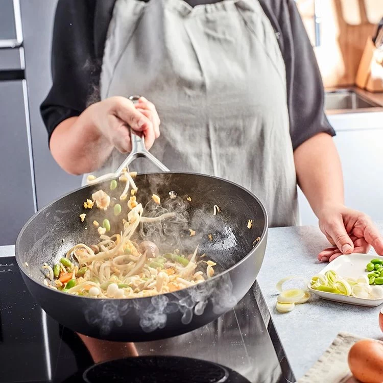 Ideaal om te wokken maar ook prima voor stomen en stoven. En omdat het oog ook wat wil, combineerde Demeyere de stijlvolle zwarte aluminium body met een zilverkleurige greep in roestvrij staal. Die bevestigden ze stevig met roestvrijstalen rivetten.