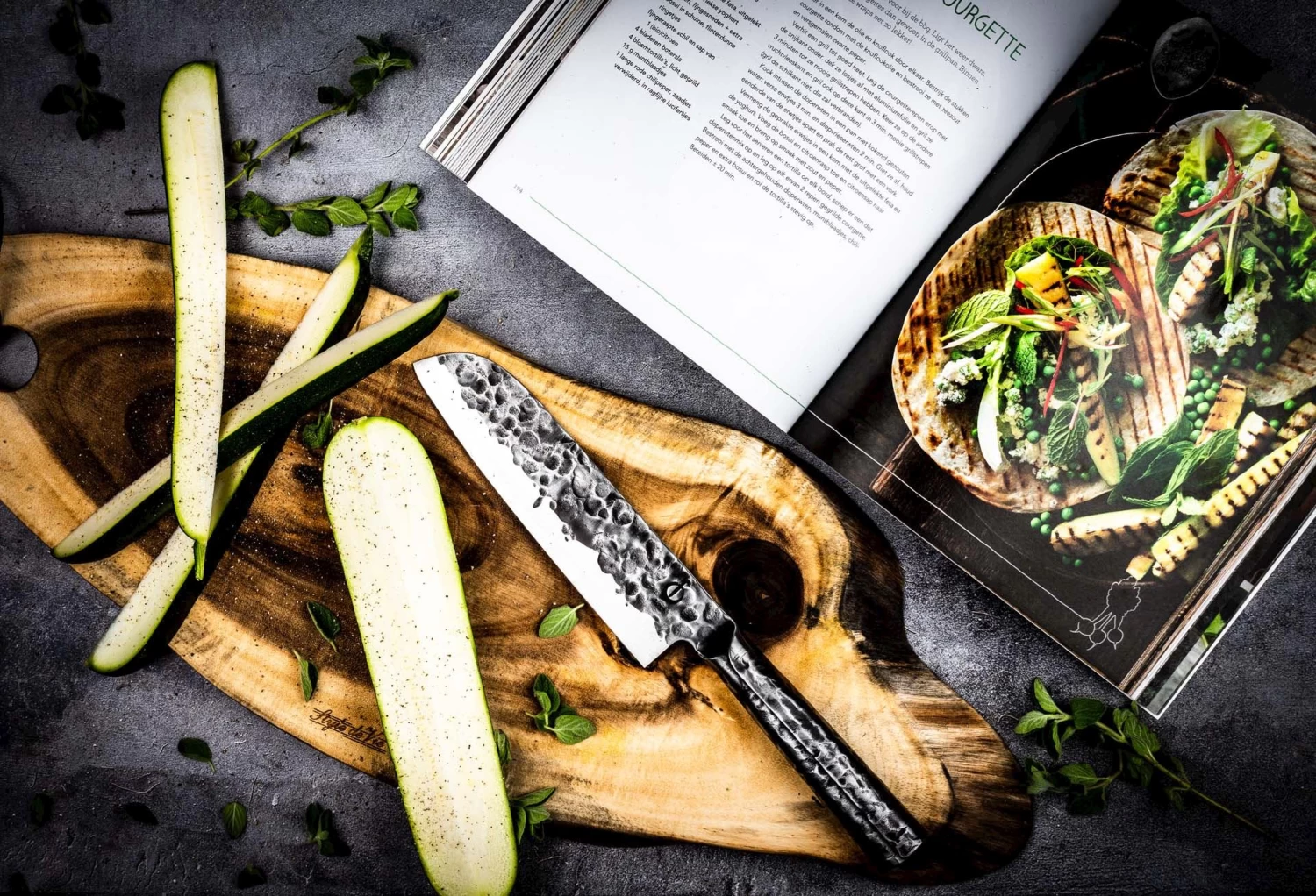 Het Forged Brute 18 cm is de Japanse versie van het koksmes. Het woord ‘santoku’ betekent ‘drie deugden’, een referentie naar de drie snijfuncties die het mes kan vervullen: plakken snijden, blokjes maken en fijnsnijden. Door deze veelzijdigheid een allrounder in de keuken te noemen. De Forged Brute messen zijn vervaardigd van Japans 440C Staal met een hardheid van 58 Rockwell. Alle Forged messen zijn met de hand gesmeed, hebben een lemmet dikte van 2 mm en een snijhoek van 18 graden. De 18 cm Brute Santokumes is verpakt in een luxe houten kistje. Ook beschikbaar in een 14 cm variant.