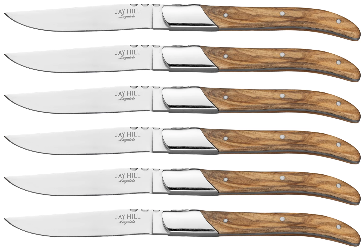 Jouw mals gebraden vlees perfect in plakjes snijden? Met deze Jay Hill steakmessen Laguiole olijfhout heb je een luxe set van 6 kwaliteits-steakmessen. Deze stijlvolle messen beschikken over een elegant handvat gemaakt van olijfhout. Het lemmet is 11.3 cm lang en 2.5 mm dik. Door het gladde snijvlak snij je eenvoudig door jouw perfect gegaarde vlees. Wil je steakmessen cadeau geven aan familie of vrienden? Deze Jay Hill steakmessen Laguiole olijfhout worden geleverd in een luxe houten kist met mooie geschenkverpakking.