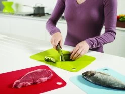 Haal praktische en stijlvolle snijplanken in huis met de Joseph Joseph Snijplankenset 3-Kleuren! Deze set bestaat uit een groene snijplank voor groenten, een blauwe snijplank voor vis, en een rode snijplank voor vlees. Zo houd jij de hygiëne op orde in jouw keuken! De snijplanken zijn gemaakt van kunststof en zijn 34 bij 24 cm. Ook handig: de snijplanken kun je gemakkelijk op elkaar bevestigen door de ring in de bovenhoek. Na gebruik kun je de snijplanken reinigen in de vaatwasser.