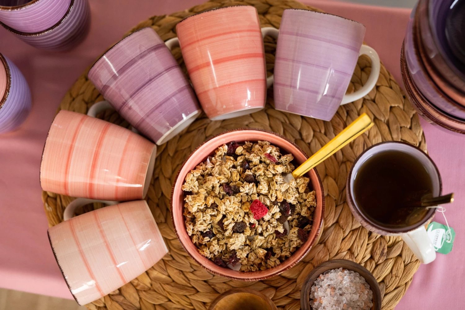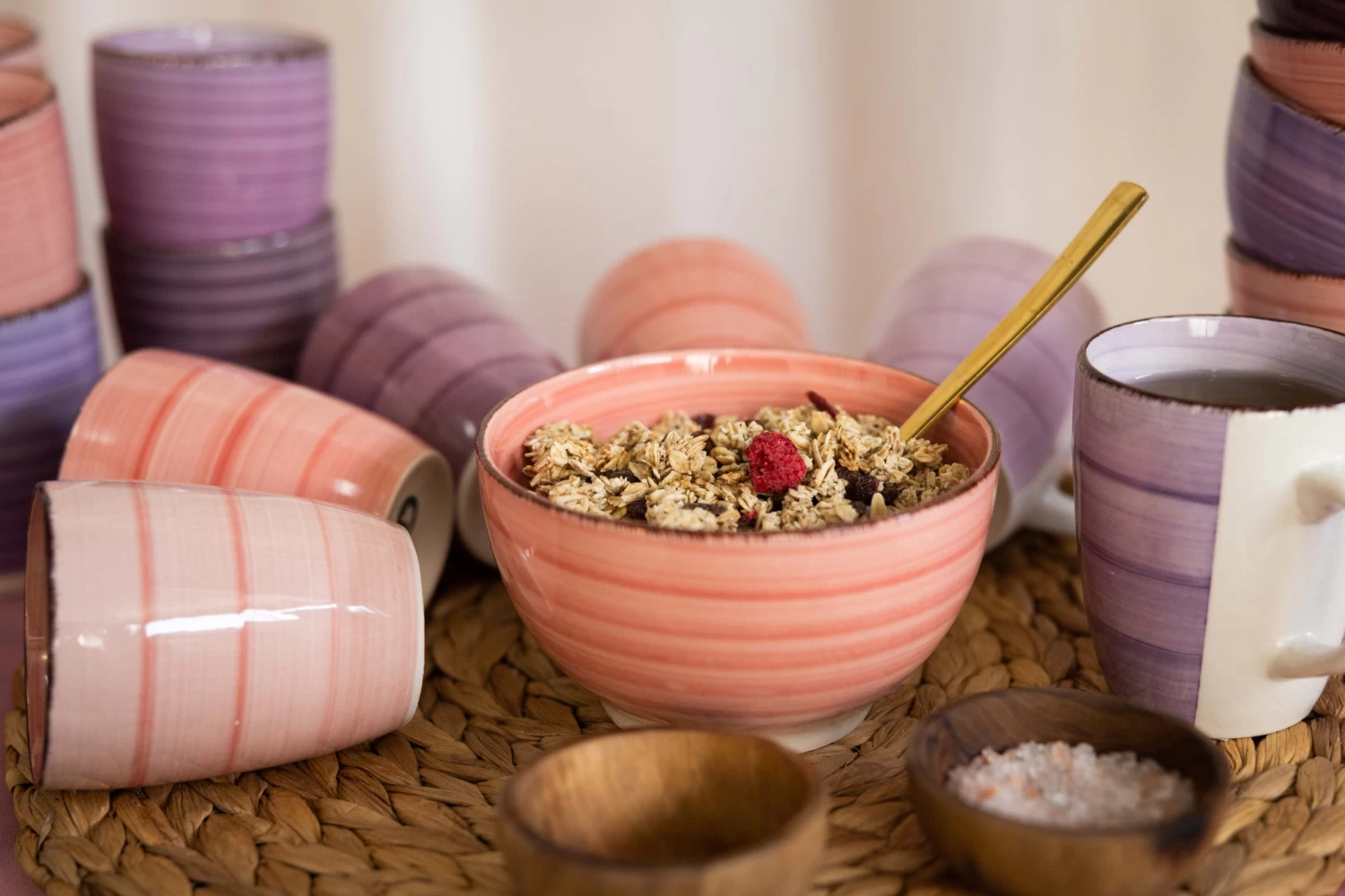 Op het Griekse Eiland Mykonos zie je, naast de typische witte huisjes met blauwe daken, ook heel veel roze bloemen. Deze collectie van Studio Tavola heeft zijn prachtige roze/ paarse kleur dan ook daaraan te danken. De verschillende tinten vormen een lief, vrolijk en zomers geheel. Combineer de verschillende dinerborden, ontbijtborden en mokken om je eigen servies te creëren of kies voor de door ons bij elkaar verzamelde serviesset. Dit servies is daarnaast ook goed te combineren met ander servies!