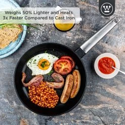 De Westinghouse Performance pannen zijn gemaakt van gegoten aluminium, waardoor ze veel lichter zijn dan de pannen van gietijzer. Hierdoor worden deze pannen drie keer zo snel warm als gietijzeren pannen en zijn ze veel makkelijker te verplaatsen van kast naar fornuis. Daarnaast zijn de pannen geschikt voor alle fornuizen en ovens!